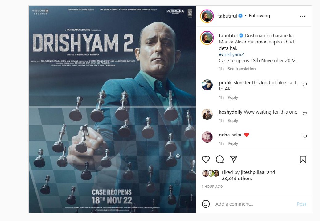 अक्षय खन्ना के फर्स्ट लुक पोस्टर को तब्बू ने अपने इंस्टाग्राम पर शेयर किया है और उनके किरदार के बारे में फैंस से रूबरू करवाया है. पोस्टर में अक्षय खन्ना को एक शतरंज बोर्ड के साथ दिखाया गया है. पोस्टर में वह बेहद सीरियस होकर शतरंज खेलते हुए नजर आ रहे हैं. तब्बू ने इंस्टाग्राम पर यह पोस्टर शेयर करते हुए कैप्शन में लिखा, “दुश्मन को हराने का मौका अक्सर दुश्मन आपको खुद देता है..दृश्यम 2. केस 18 नवंबर 2022 को फिर से खुलेगा.”