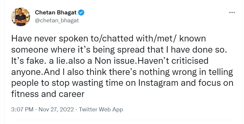 चेतन भगत के इस बयान के बाद अब उर्फी जावेद ने भी अपना रिएक्शन दिया है। हर मुद्दे पर खुलकर अपने विचार रखने वाली उर्फी ने चेतन भगत को करारा जवाब दिया है। उर्फी ने कथित तौर पर चेतन भगत के व्हाट्सएप चैट्स के स्क्रीनशॉट्स शेयर कर उन्हें मी टू मूवमेंट की याद दिला दी है। इतना ही नहीं चेतन भगत ने ये भी कहा कि ‘उर्फी की गलती नहीं है, वो अपना करियर बना रही है। लोग बिस्तर में घुस कर उर्फी की तस्वीरें देख रहे हैं। आज मैं भी उर्फी की तस्वीर देख कर आया हूं। उर्फी जावेद जैसे लोग मिलते रहते हैं। इस पर कहानियां बनती रहती हैं।’\