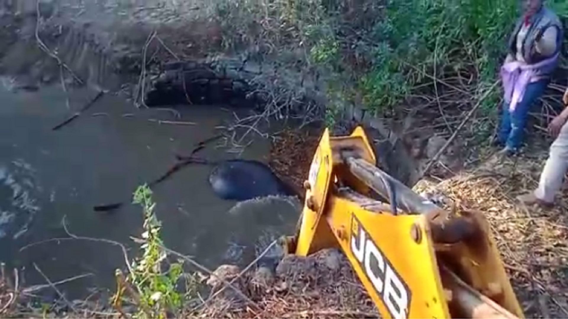 जशपुर में कुएं में गिरे हाथी के बच्चे को वन विभाग की टीम ने जेसीबी से बाहर निकाला।