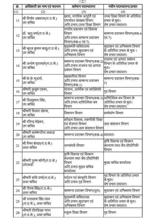 ऑर्डर के मुताबिक, कई अधिकारियों को प्लानिंग, महिला और बाल विकास, कमर्शियल टैक्स, टेक्निकल एजुकेशन, ट्राइबल डेवलपमेंट, अर्बन एडमिनिस्ट्रेशन, फूड, सिविल सप्लाई और हायर एजुकेशन समेत कई ज़रूरी डिपार्टमेंट में पोस्ट किया गया है।