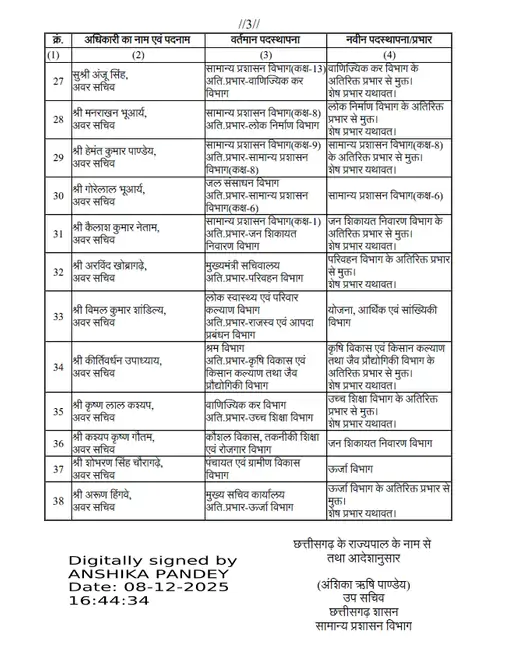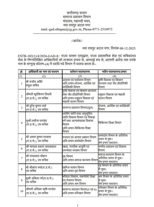 छत्तीसगढ़ सरकार ने स्टेट एडमिनिस्ट्रेटिव सर्विस और सेक्रेटेरिएट सर्विस के 38 अधिकारियों का ट्रांसफर कर दिया है। उनके डिपार्टमेंट और ज़िम्मेदारियां बदल दी गई हैं। जनरल एडमिनिस्ट्रेशन डिपार्टमेंट (GAD) ने सोमवार को एक ऑर्डर जारी किया, जिसमें कहा गया कि ये बदलाव तुरंत लागू होंगे। सभी अधिकारियों को चार्ज संभालने के बाद अपनी नई पोस्टिंग पर रिपोर्ट करने का निर्देश दिया गया है।
