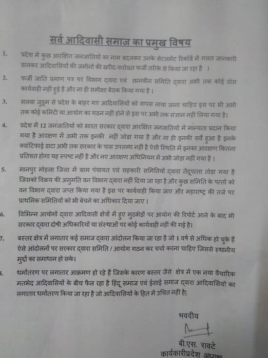 दरअसल, सर्व आदिवासी समाज सोहन पोटाई धड़े के कार्यकारी अध्यक्ष बीएस रावटे और गोंडवाना गोंड महासभा के अध्यक्ष अकबर राम कोर्राम की अगुवाई में कई जिलों से पदाधिकारी बुधवार को राजभवन पहुंचे थे। इस दौरान समाज की ओर से राज्यपालको एक मांगपत्र सौंपा गया। इसमें कहा गया कि धर्मांतरण की वजह से बस्तर क्षेत्र में आदिवासियों के बीच वैचारिक मतभेद बढ़ रहा है। हिंदू और ईसाई समाज द्वारा हिंदुओं का लगातार धर्मांतरण किया जा रहा है। यह आदिवासियों के हित में उचित नहीं है।