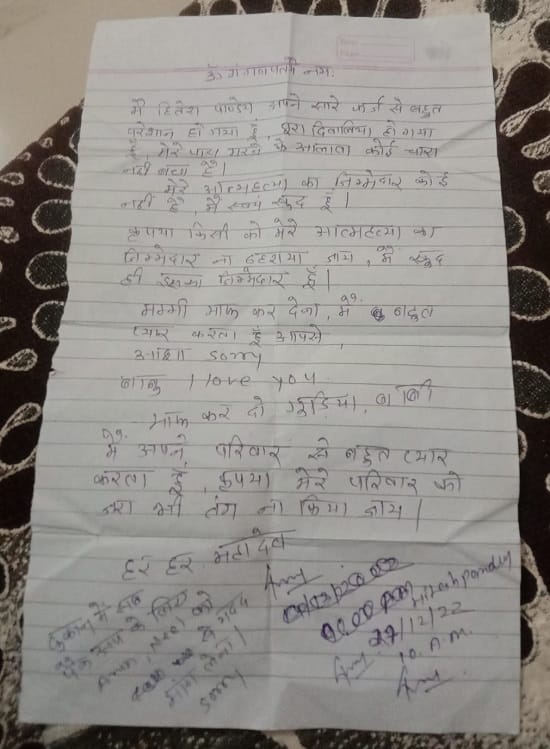 घटना की सूचना मिलने पर पुलिस भी पहुंच गई। उसने शव को नीचे उतरवाया। वहीं एक सुसाइड नोट भी मिला है। इसमें कर्ज से परेशान होने की बात लिखी हुई है। साथ ही लिखा है कि वह दिवालिया हो चुका है। उसके पास मरने के अलावा कोई रास्ता नहीं है। सॉरी मां, पापा I Love You, मैं अपने परिवार से बहुत प्यार करता हूं। माफ करना। मेरे परिवार को जरा भी तंग न किया जाए। पुलिस ने सुसाइड नोट जब्त कर लिया है।