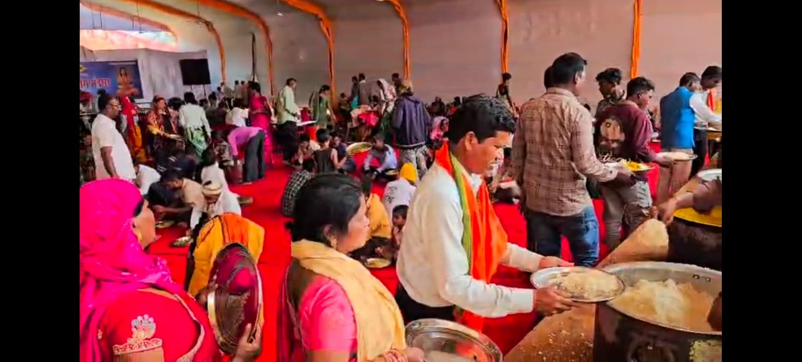 इसके बाद श्रद्धालुओं को थाली में बड़े आदर भाव से भोजन कराया जाता है। मंदिर ट्रस्ट, साहू समाज और अन्य श्रद्धालुओं के आर्थिक सहयोग के साथ दर्जनों स्वयंसेवक रोजाना समय दान देकर पंडाल में सेवा करते हैं।