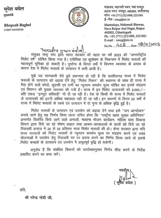 मुख्यमंत्री भूपेश बघेल ने प्रधानमंत्री नरेन्द्र मोदी को पत्र लिखकर उनसे मिलेट फसलों के उत्पादन एवं उपभोग को बढ़ावा देने और इसे जनआंदोलन बनाने के लिए पहल करने का आग्रह किया है। पत्र में 'राष्ट्रीय खाद्य सुरक्षा अधिनियम' अन्तर्गत वितरित किए जाने वाले अनाजों, मध्यान्ह भोजन कार्यक्रम, महिला बाल विकास विभाग की ओर से दिये जा रहे पोषण आहार तथा आश्रम-छात्रावासों के छात्रों को दिए जा रहे रियायती अनाज में 20 से 25 प्रतिशत मात्रा मिलेट फसलों की शामिल करने का आग्रह किया।
