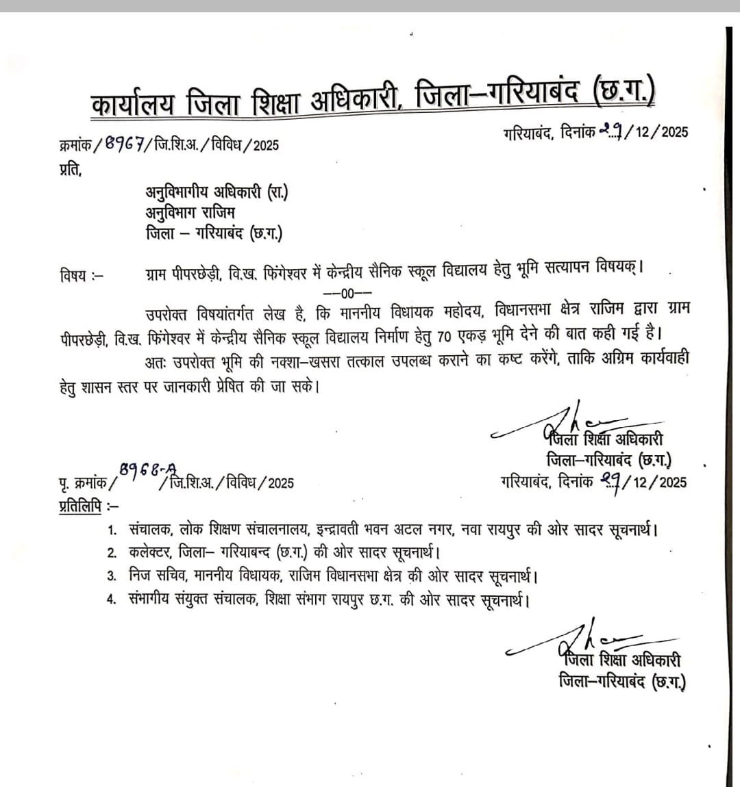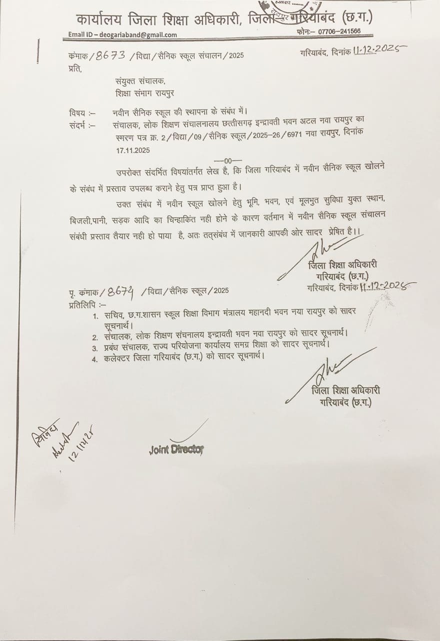 दरअसल, स्वीकृत सैनिक स्कूल के लिए नियमों के अनुसार जिला मुख्यालय या किसी ऐसे उपयुक्त स्थान का चयन किया जाना था, जहां 70 acre land requirement पूरी हो सके। इसके लिए शिक्षा विभाग को जिले के पांचों अनुविभागों के एसडीएम को पत्र लिखकर स्थल की जानकारी मंगानी थी। लेकिन आरोप है कि जिला शिक्षा अधिकारी ने केवल Rajim SDM को पत्र लिखकर राजिम के आसपास जमीन चिन्हांकन की प्रक्रिया शुरू कर दी, जो administrative transparency पर बड़ा सवाल खड़ा करता है।