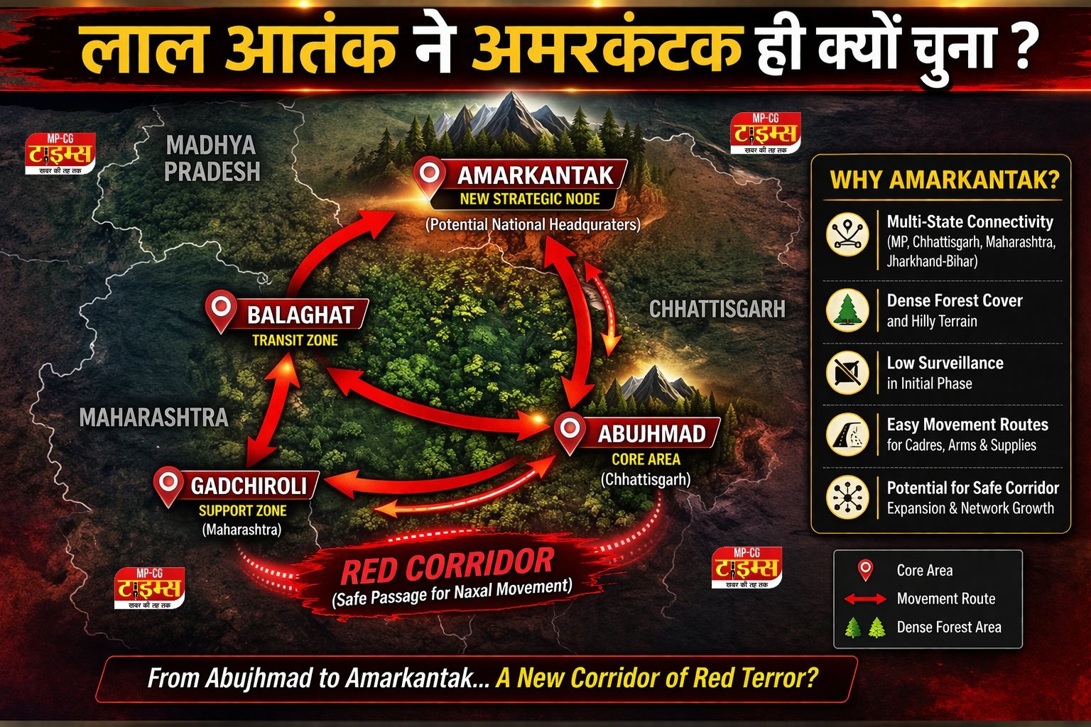 नक्सली अमरकंटक को हेडक्वॉर्टर बनाने की ओर इसलिए बढ़ रहे थे क्योंकि यह इलाका भौगोलिक रूप से बेहद रणनीतिक है। यह मध्य प्रदेश और छत्तीसगढ़ की सीमा पर स्थित होकर कई नक्सल प्रभावित क्षेत्रों को जोड़ने वाला कनेक्टिंग पॉइंट बनता है।