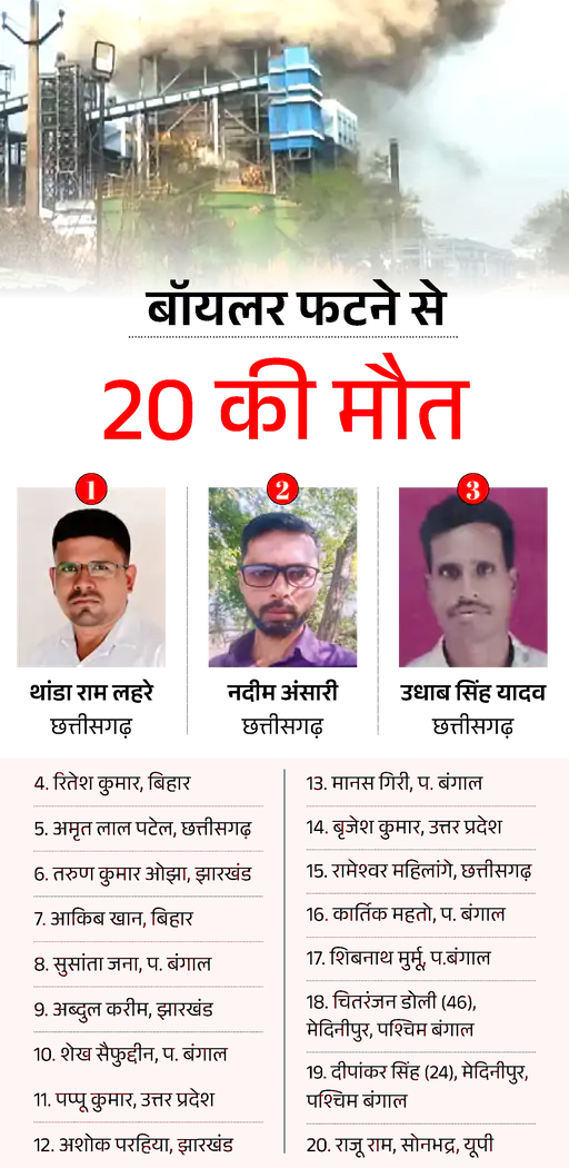 छत्तीसगढ़ के सक्ती जिले में वेदांता पावर प्लांट हादसे में अब तक 20 मौतें हो चुकी हैं। 4 की मौके पर ही जान गई, जबकि 14 की मौत रायगढ़ के अलग-अलग अस्पतालों में हुई। 2 की मौत रायपुर के कालड़ा अस्पताल में इलाज के दौरान हुई। प्लांट में मंगलवार दोपहर बॉयलर ब्लास्ट हो गया था। मृतकों में 5 छत्तीसगढ़ से हैं, जबकि बाकी यूपी, बिहार, झारखंड और पश्चिम बंगाल से हैं।