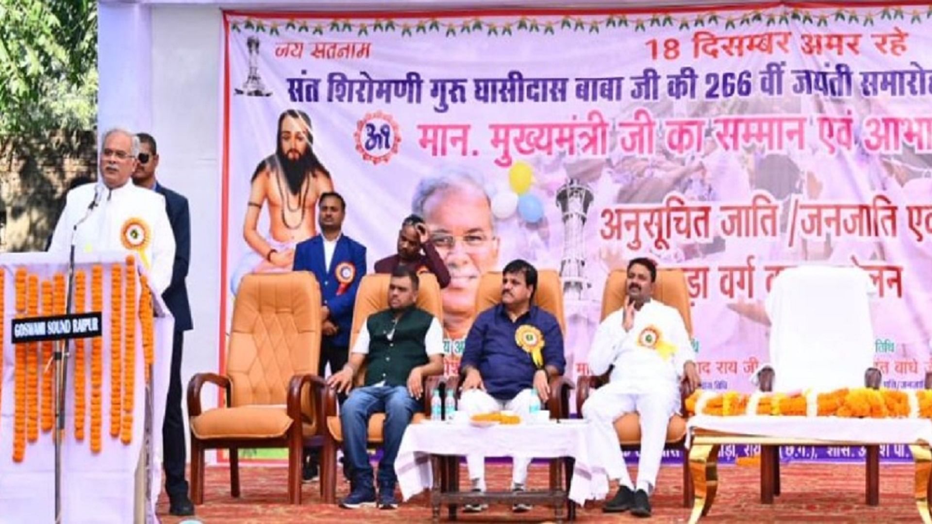 पेंशन बाड़ा में हो रहे कार्यक्रम में मुख्यमंत्री बघेल ने कहा कि, गुरू घासीदास ऐसे संत थे, जिन्होंने मानवता को बचाने के लिए मानव-मानव एक समान का संदेश दिया। उन्होंने समाज में फैली कुरूतियों को दूर करने के लिए समानता, भाईचारा, प्रेम और सद्भाव का भी संदेश दिया। मुख्यमंत्री ने कहा, गुरू घासीदास ने छत्तीसगढ़ी में उपदेश दिया। उन्होंने छत्तीसगढ़ी भाषा बोली को आगे बढ़ाने का काम किया है। इस अवसर पर SC-ST-OBC संघ ने मुख्यमंत्री को सम्मानित किया।
