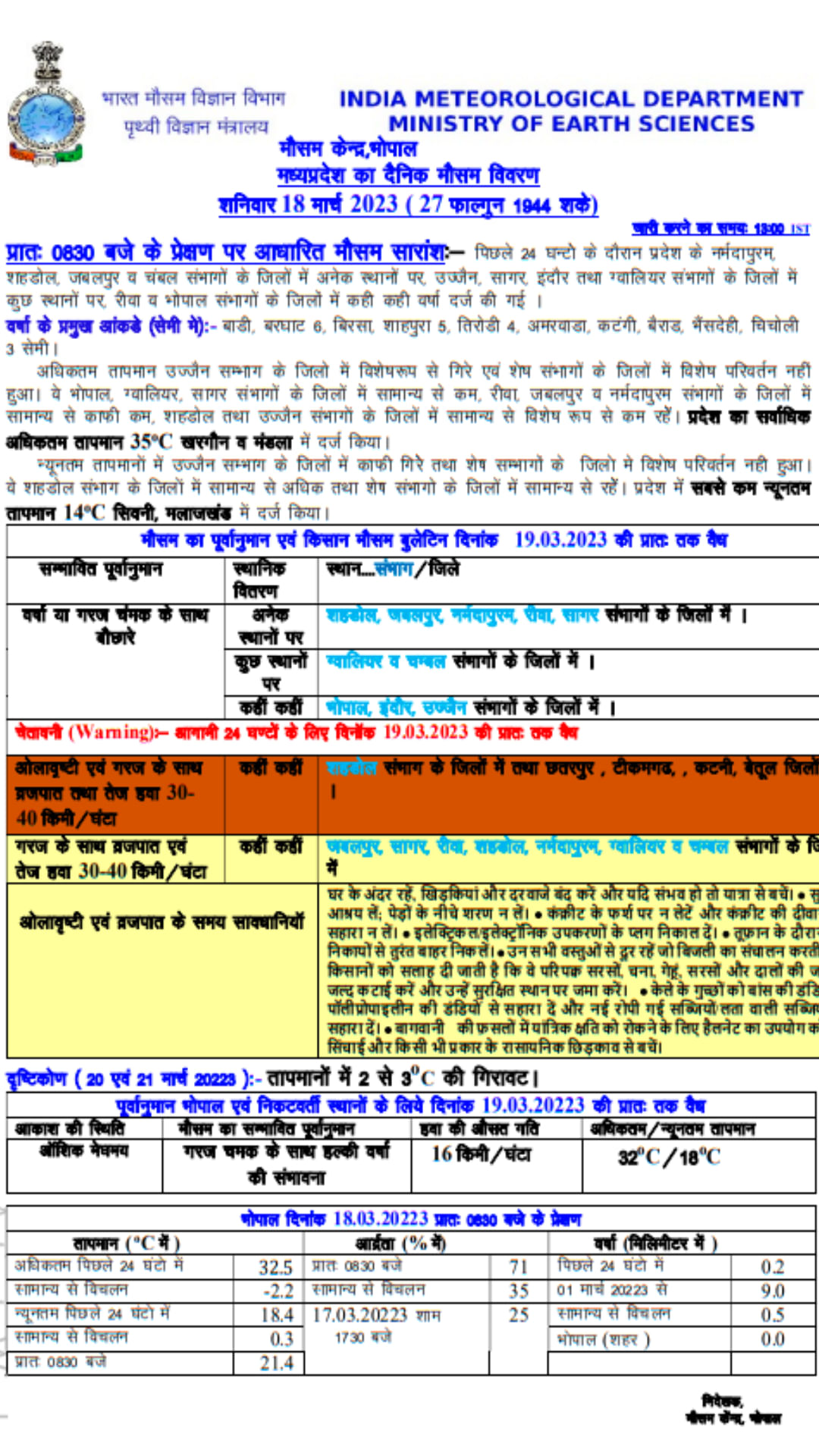 मौसम विभाग की मानें तो बीते 24 घंटों में प्रदेश के नर्मदापुरम, शहडोल, जबलपुर, चंबल संभाग के जिलों में अनेक स्थानों पर, उज्जैन, सागर, इंदौर तथा ग्वालियर संभाग के जिलों में कुछ स्थानों पर, रीवा-भोपाल संभाग के जिलों में कहीं-कहीं वर्षा दर्ज की गई। अगले 24 घंटों का पूर्वानुमान कहता है कि शहडोल, जबलपुर, नर्मदापुरम, रीवा, सागर संभागों के जिलों में अनेक स्थानों पर, ग्वालियर-चंबल संभाग के जिलों में कुछ स्थानों पर, भोपाल, इंदौर, उज्जैन संभाग के जिलों में कहीं-कहीं वर्षा हो सकती है। इसके साथ ही जबलपुर, सागर, रीवा, शहडोल, नर्मदापुरम, ग्वालियर, चंबल संभागों के जिलों में कहीं-कहीं बिजली गिरने की आशंका जताई गई है।
