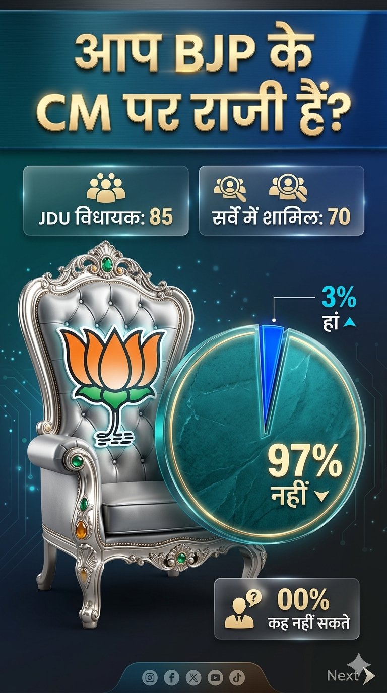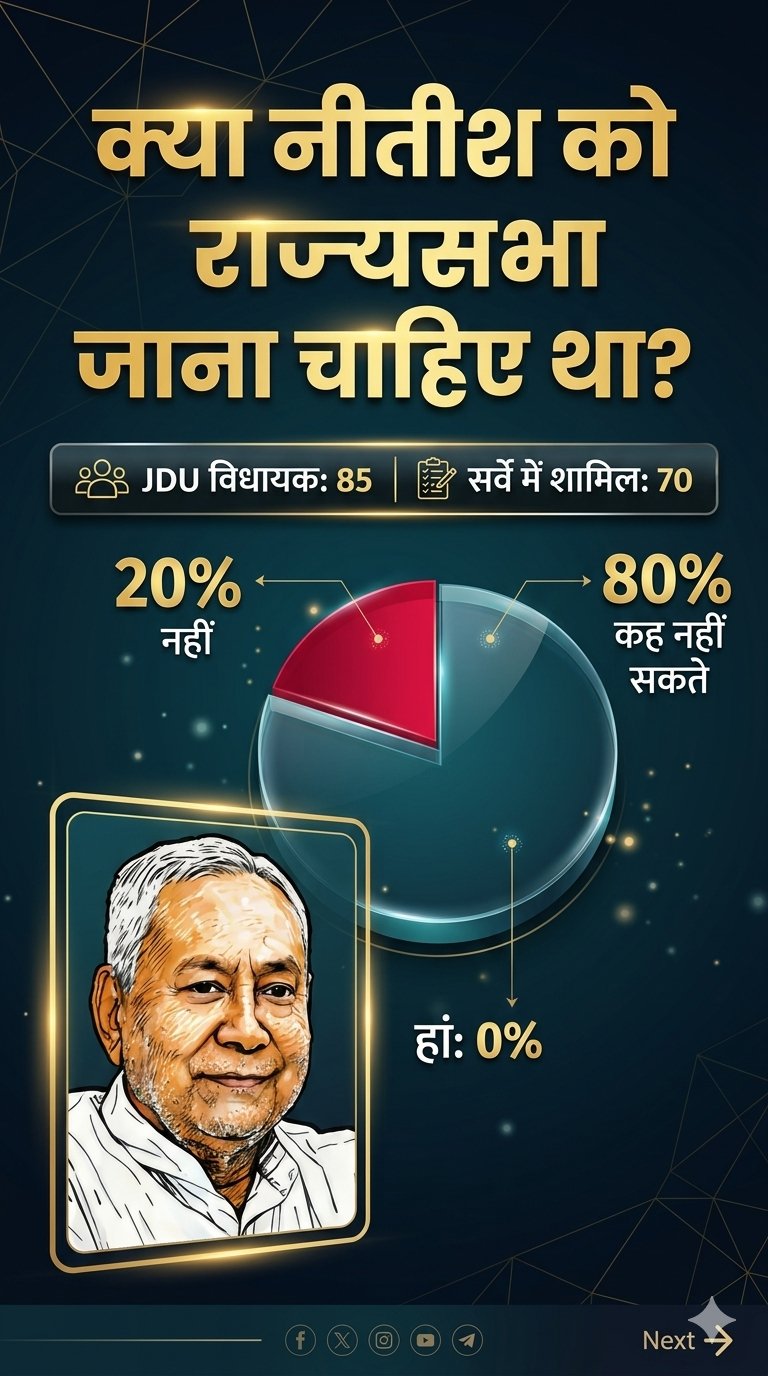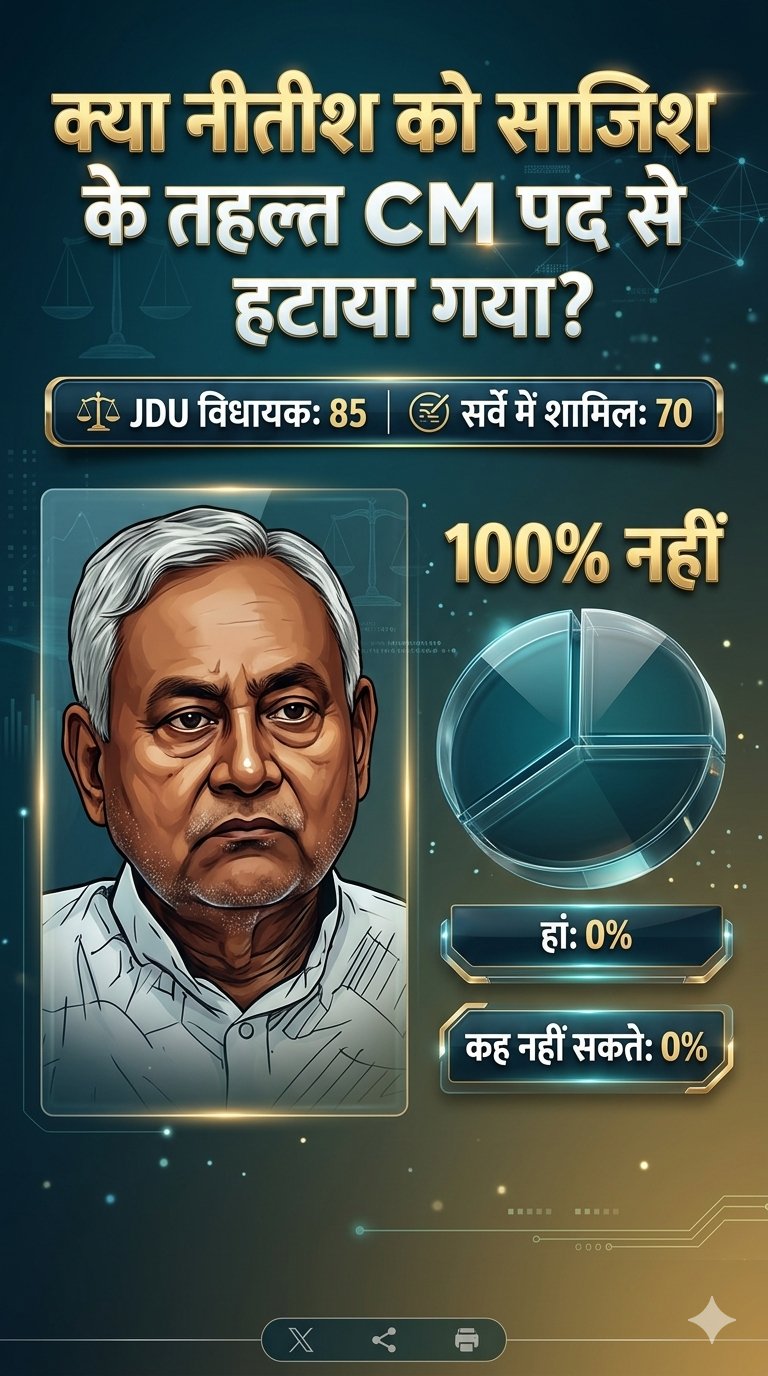 बिहार में JDU के 85 में से 68 विधायक नहीं चाहते कि नीतीश कुमार की जगह BJP का CM बने। वे नीतीश के बेटे निशांत कुमार को CM बनाने के पक्ष में हैं। सिर्फ 2 विधायकों ने कहा कि डिप्टी CM सम्राट चौधरी को मुख्यमंत्री बनाया जाना चाहिए।