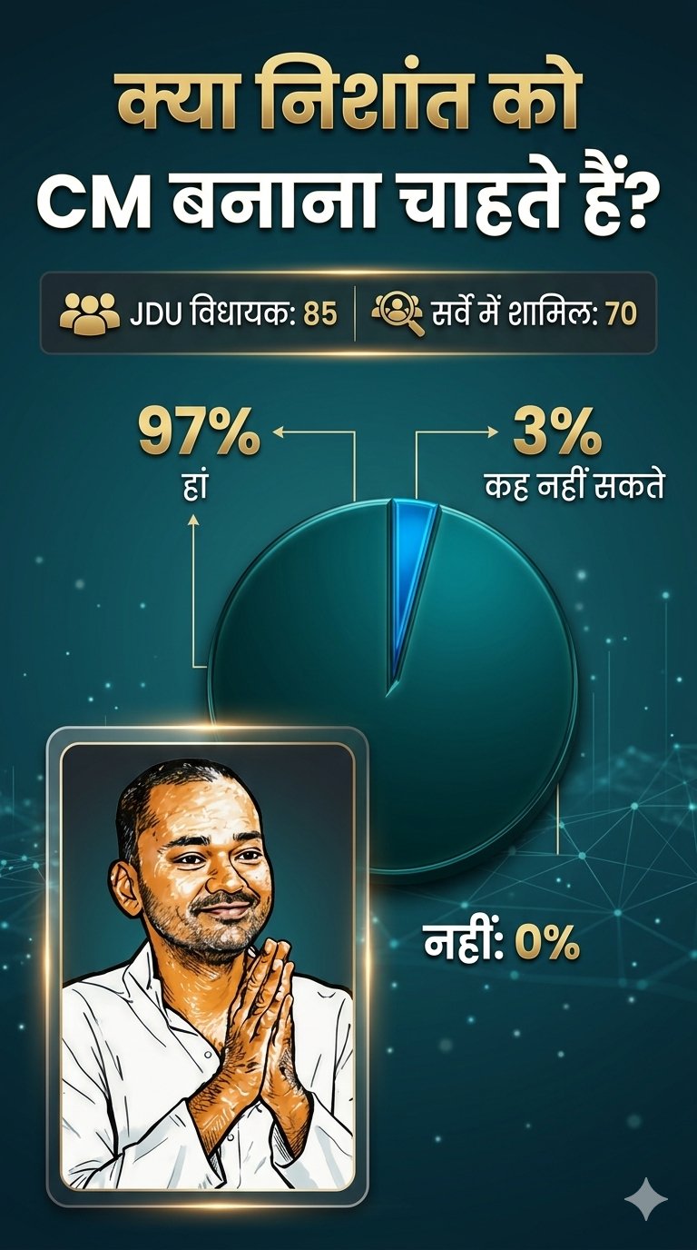 सर्वे में शामिल 70 विधायकों में से 97% विधायक निशांत को CM बनाना चाहते हैं। उनका कहना है कि 20 साल से CM पद JDU के पास है, आगे भी रहना चाहिए।
