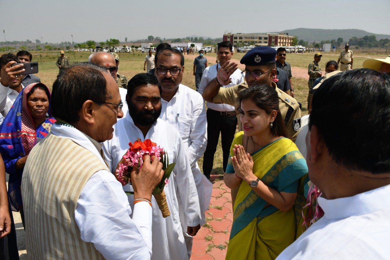 इंदिरा गांधी जनजाति विश्वविद्यालय में मुख्यमंत्री शिवराज सिंह चौहान का कलेक्टर सोनिया मीना, एसपी अखिल पटेल और IGNTU के कुलपति ने स्वागत किया.