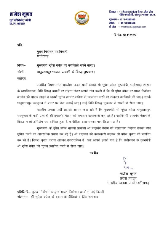 भाजपा प्रदेश प्रवक्ता और पूर्व मंत्री राजेश मूणत ने मुख्यमंत्री भूपेश बघेल की शिकायत मुख्य निर्वाचन पदाधिकारी से की है। इसमें कहा है कि मुख्यमंत्री लगातार भाजपा प्रत्याशी ब्रह्मानंद नेताम को दुष्कर्मी कह रहे हैं। जबकि न तो आरोप पत्र में नाम है और न पीड़िता ने लिया है। ऐसे में ब्रह्मानंद की छवि धूमिल कर चुनाव को प्रभावित कर रहे हैं। यह आचार संहित का उल्लंघन है। इसके लिए मुख्यमंत्री भूपेश बघेल के चुनाव प्रचार पर तत्काल रोक लगाई जाए।
