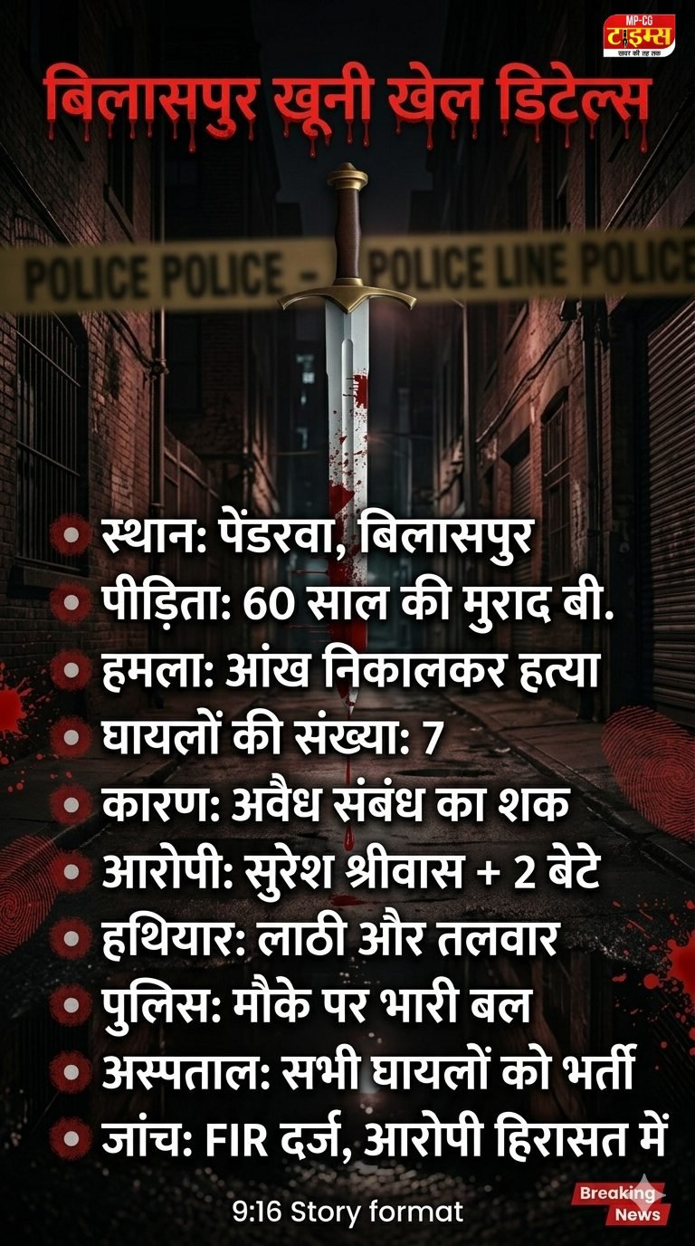 Bilaspur Woman Murder Case | 7 Injured in Brutal Attack Over Affair: छत्तीसगढ़ के बिलासपुर जिले के पेंडरवा गांव में एक बुजुर्ग महिला की आंख निकालकर हत्या कर दी गई। इस हमले में 7 लोग गंभीर रूप से घायल हो गए। पुलिस और प्रशासन ने पूरे इलाके में अलर्ट जारी कर दिया है।