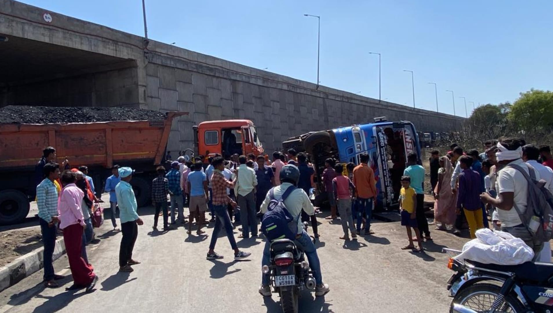 : ट्रेलर की टक्कर से पलटी बस: कई यात्री घायल, दो की हालत गंभीर; बिलासपुर में लोखंडी-तुर्काडीह मार्ग पर हादसा