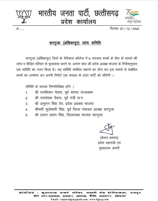 भाजपा प्रदेश महामंत्री केदार कश्यप ने बताया कि, सरगुजा जिले के मेडिकल कॉलेज में नवजातों की मौत के मामले की जांच और पीड़ित परिवारों से मुलाकात करने के लिए समिति का गठन किया गया है। इसके लिए प्रदेश अध्यक्ष अरुण साव ने निर्देश जारी किए थे। यह जांच समिति संबंधित स्थानों का दौरा कर इस मामले से तथ्यों की जांच कर अपनी रिपोर्ट एक सप्ताह में पार्टी को सौंपेगी।