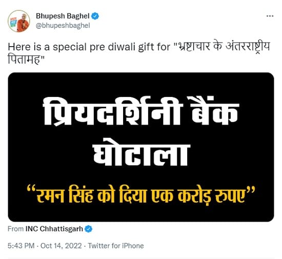 छत्तीसगढ़ के अलग-अलग जिलों में चल रही प्रवर्तन निदेशालय (ED) की कार्रवाई के बाद राजीनितिक उफान पर है। सियासी पारा इस कदर चढ़ा हुआ है कि जुबानी जंग सोशल मीडिया पर पोस्ट और वीडियो शेयरिंग तक पहुंच चुकी है। मुख्यमंत्री भूपेश बघेल और पूर्व CM रमन सिंह के बीच डिजीटल प्लेटफार्म पर जारी जंग के बीच शुक्रवार शाम एक नया वीडियो आया है। CM भूपेश ने रायपुर के प्रियदर्शिनी सहकारी बैंक घोटाले से जुड़े इस वीडियो को शेयर करते हुए लिखा है, 'हेयर इज प्री दिवाली गिफ्ट फॉर भ्रष्टाचार के अंतरराष्ट्रीय पितामाह'।