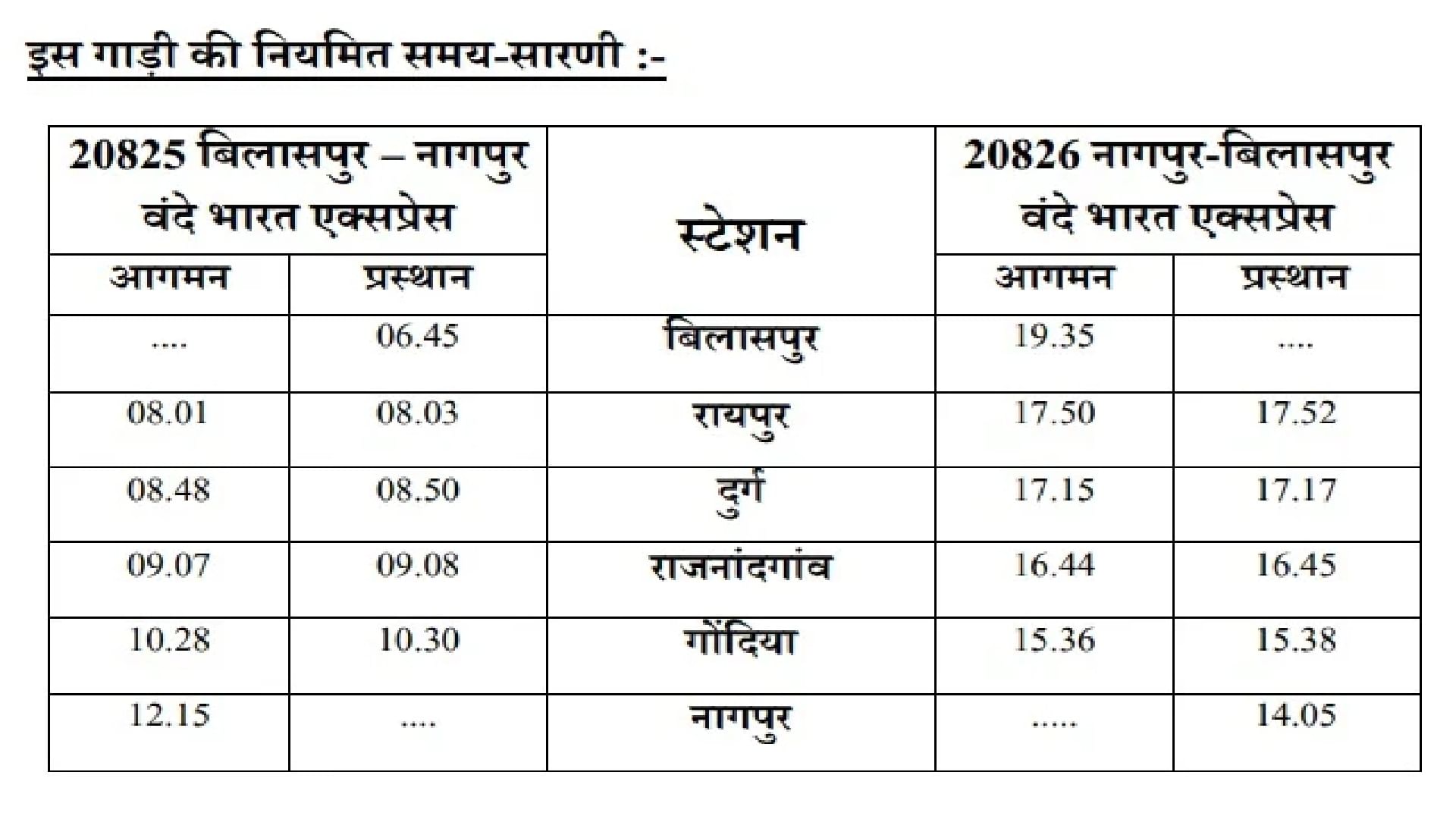 रेलवे की ओर से वंदे भारत ट्रेन का टाइम शेड्यूल भी जारी कर दिया गया है। इसके चलने से यात्रियों को बेहतर और अच्छी सुविधा मिलेगी। रेलवे की ओर से ट्रेन में रिजर्वेशन भी शनिवार से शुरू हो गया था। IRCTC ने बिलासपुर से नागपुर के लिए चेयरकार का किराया AC-II के बराबर 1077 रुपये, एग्जीक्यूटिव क्लास के लिए 2,045 रुपये टिकट के दाम तय किए गए हैं। ट्रेन में 16 कोच हैं जिनमें 14 चेयर कार और 2 एग्जीक्यूदटव चेयर कार शामिल हैं। कुल बैठने की क्षमता 1128 है।