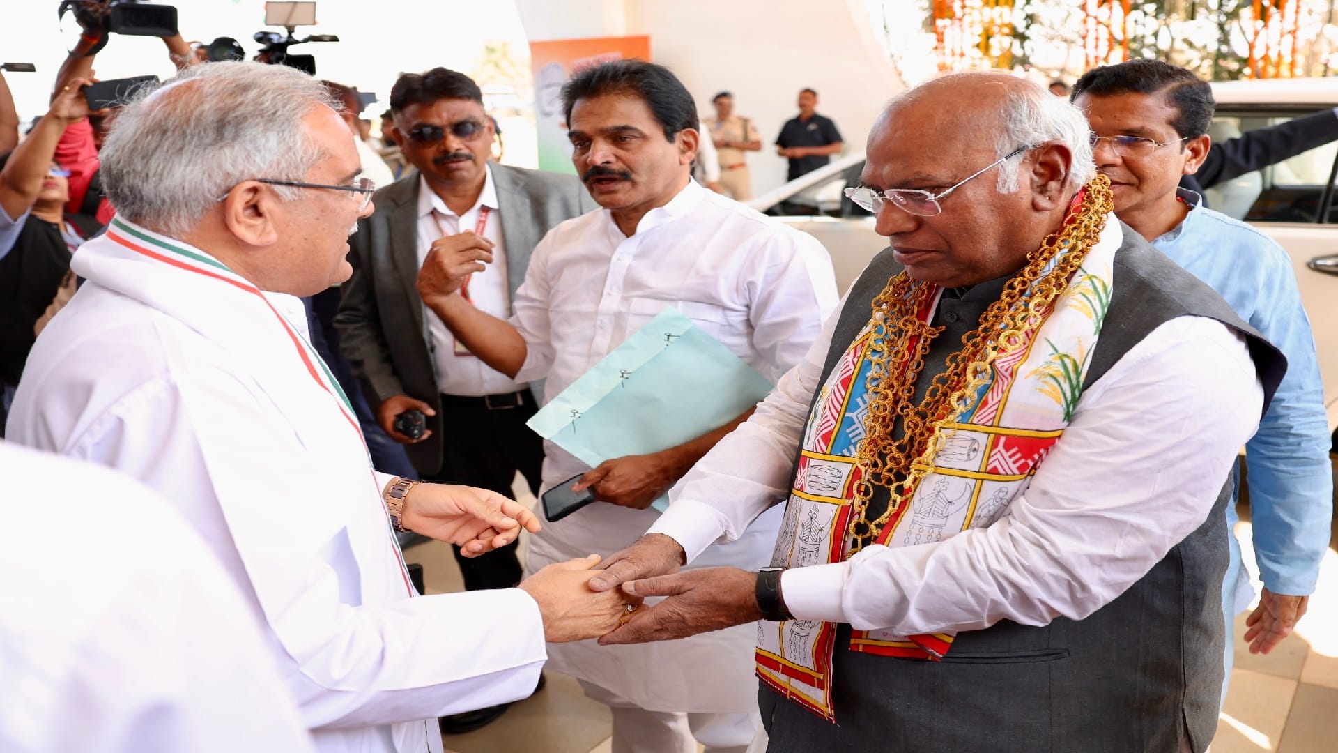 85वें महाअधिवेशन में पहुंचने पर छत्तीसगढ़ के मुख्यमंत्री श्री @bhupeshbaghel ने विभिन्न पदाधिकारियों का स्वागत किया। #INCPlenaryInCG pic.twitter.com/Hzh3gS3V5Z