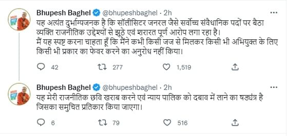 मुख्यमंत्री भूपेश बघेल ने इसे लेकर ट्वीट भी किया है। इसमें उन्होंने कहा है कि यह उनकी राजनीतिक छवि खराब करने का षड्यंत्र है। वहीं न्याय पालिका पर भी दबाव बना रहे हैं। उन्होंने कहा कि इसका समुचित प्रतिकार किया जाएगा। एक दिन पहले भी ईडी के आरोपों पर छत्तीसगढ़ सरकार की ओर से सुप्रीम कोर्ट में बताया गया था कि मुख्यमंत्री भूपेश बघेल ने कभी किसी हाई कोर्ट के न्यायाधीश से मुलाकात नहीं की है। इसके बाद अब मुख्यमंत्री की ओर से भी सोशल मीडिया पर कमेंट किया गया।