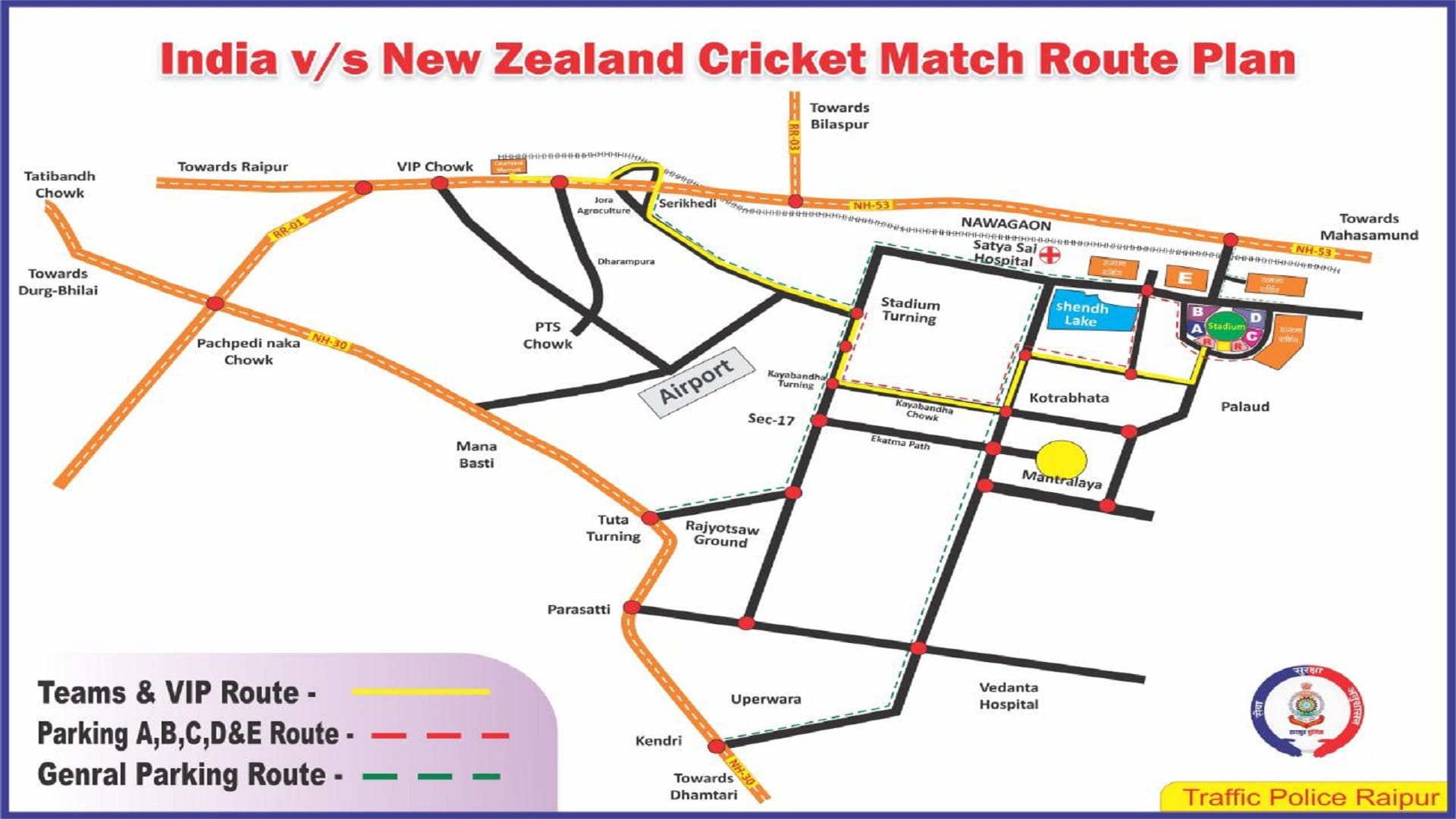 क्रिकेट मैच के दौरान सुगम और सुरक्षित यातायात व्यवस्था के लिए नया रायपुर में सुबह 11 बजे से रात 2 बजे तक भारी वाहनों का आवागमन पूरी तरह से प्रतिबंधित किया गया है। मैच के दौरान राज्य के कई जिलों से दर्शक बड़ी संख्या में स्टेडियम पहुंचेंगे। ऐसे में दर्शकों की सुरक्षा को यातायात के लिए भारी वाहनों का आवागमन प्रतिबंधित रहेगा।