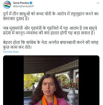 बेहतर होता कांग्रेस नेता कुछ काम कर लेते BJP नेता और राज्यसभा सांसद सरोज पांडेय ने ट्वीट के साथ वीडियो पोस्ट किया है। कहा कि, दुर्ग जिला मुख्यमंत्री का गृह जिला है। वहां साधुओं पर हमला हुआ है। पुलिस अभी भी संज्ञान में नहीं ले रही है। पहले कवर्धा में हुआ। कांग्रेस सरकार आने के बाद छत्तीसगढ़ में इस तरह की घटनाएं बढ़ी है। जब उनके गृहजिले में यह आलम है तब समूचे प्रदेश में कानून-व्यवस्था की क्या हालत होगी, यह बड़ा सवाल है। बेहतर होता कि कांग्रेस के नेता अनर्गल बयानबाजी करने की जगह कुछ काम कर लेते।