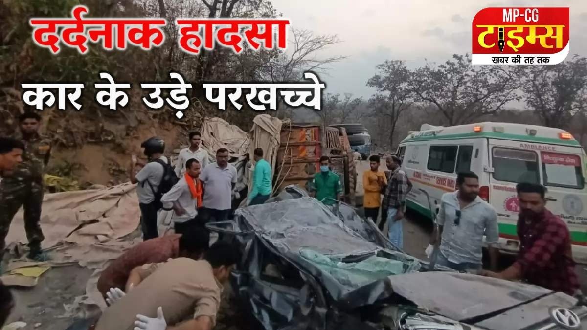 : छत्तीसगढ़ में सड़क हादसा, 4 की मौत: कार के ऊपर पलटा सीमेंट पोल से भरा ट्रक, एक घंटे तक गाड़ी में फंसी रही चारों की लाश