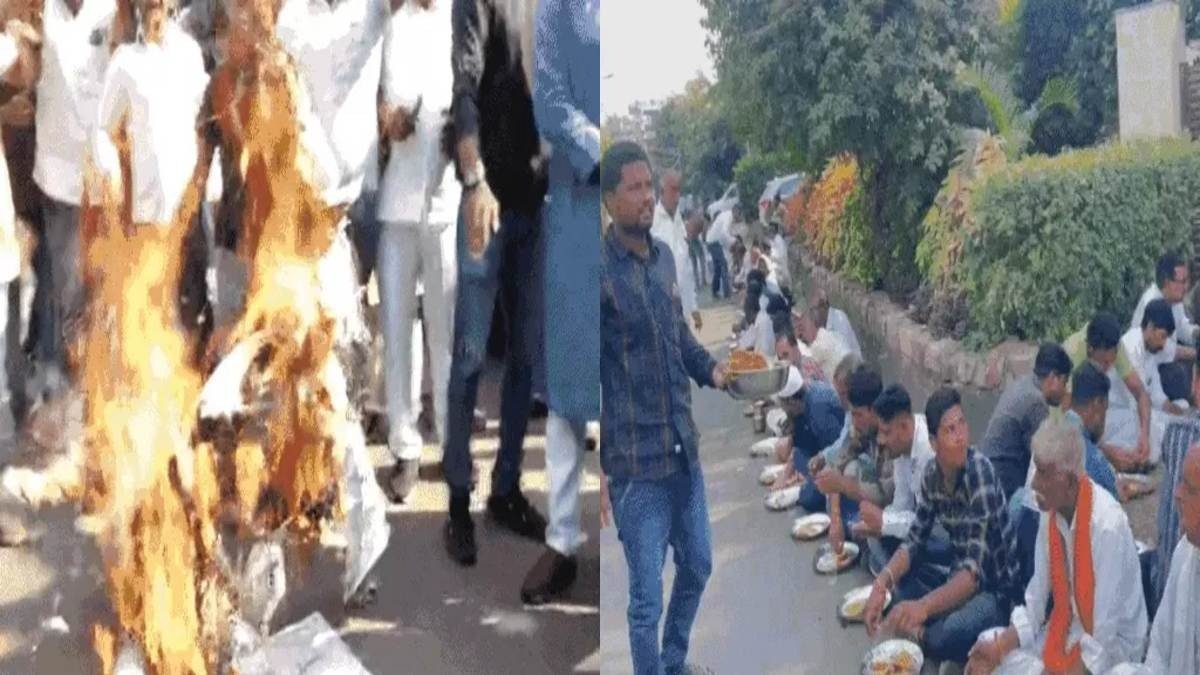 : MP में कांग्रेस के टिकट बंटवारे का विरोध: दिग्विजय की फोटो पर जूते मारे, गोबर पोता, कमलनाथ के बंगले के बाहर लगाई पंगत