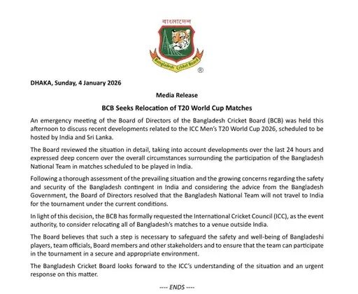 IPL बैन से एक दिन पहले, 4 जनवरी को बांग्लादेश क्रिकेट बोर्ड (BCB) ने टी-20 वर्ल्ड कप के लिए अपनी टीम भारत भेजने से इनकार कर दिया था। साथ ही BCB ने ICC से अनुरोध किया था कि बांग्लादेश के मुकाबले श्रीलंका में कराए जाएं। इस संबंध में बोर्ड ने आधिकारिक मीडिया रिलीज भी जारी की थी।