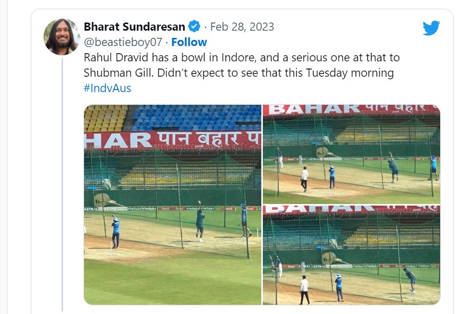 इंदौर टेस्ट से पहले टीम इंडिया के नेट सेशन में द्रविड़ की शुभमन गिल को गेंदबाजी करने की तस्वीरें वायरल हो रही हैं. द्रविड़ का नेट सेशन में गेंदबाजी करने का फैसला कई हर किसी के लिए हैरान करने वाला है. ऐसा कम ही देखने को मिलता है कि हेड कोच किसी खिलाड़ी को नेट सेशन में गेंदबाजी करे. अब इसका मकसद क्या है? इस बारे में तो टीम इंडिया मैनेजमेंट ही सही-सही जानकारी दे सकता है.