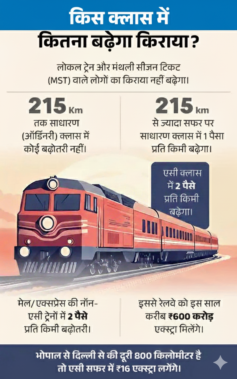Indian Railways Train Ticket Price Hike List | IRCTC Fare Structure 2026: Rail Fare Hike के तहत भोपाल से दिल्ली जाने के लिए 16 रुपए एक्सट्रा देने होंगे; नया किराया 26 दिसंबर 2025 से लागू होगा। भारतीय रेलवे ने लंबी दूरी की यात्रा करने वाले यात्रियों के लिए Train Ticket Price Increase की घोषणा की है।