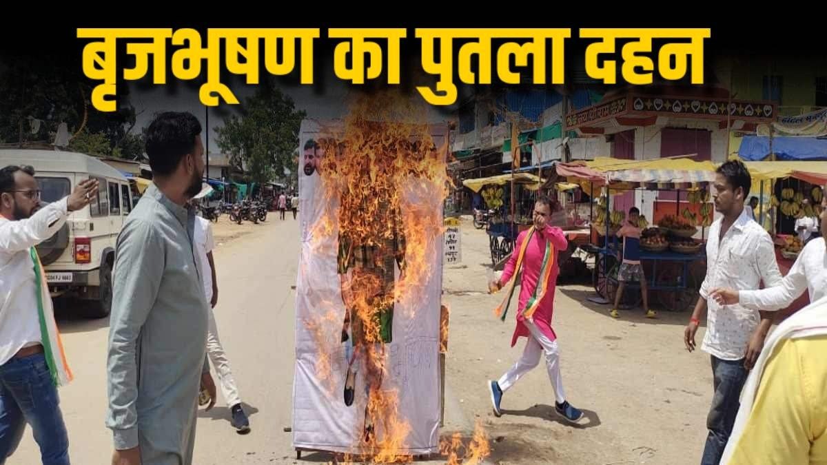 : BJP सांसद का रावण रूपी पुतला दहन: महिला कांग्रेस का स्मृति ईरानी पर अटैक, कहा- चुप्पी साधे बैठी, महिला खिलाड़ियों को भाजपा सरकार जूते तले रौंद रही