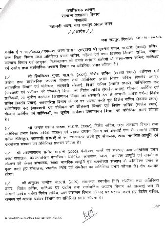 छत्तीसगढ़ सामान्य प्रशासन विभाग और गृह विभाग की ओर से तबादला आदेश जारी किए गए हैं। इसके तहत अफसरों को नई जिम्मेदारियां दी गई हैं। हालांकि IAS अफसर भुवनेश यादव और हिमशिखर गुप्ता का कद बढ़ाया गया है।
