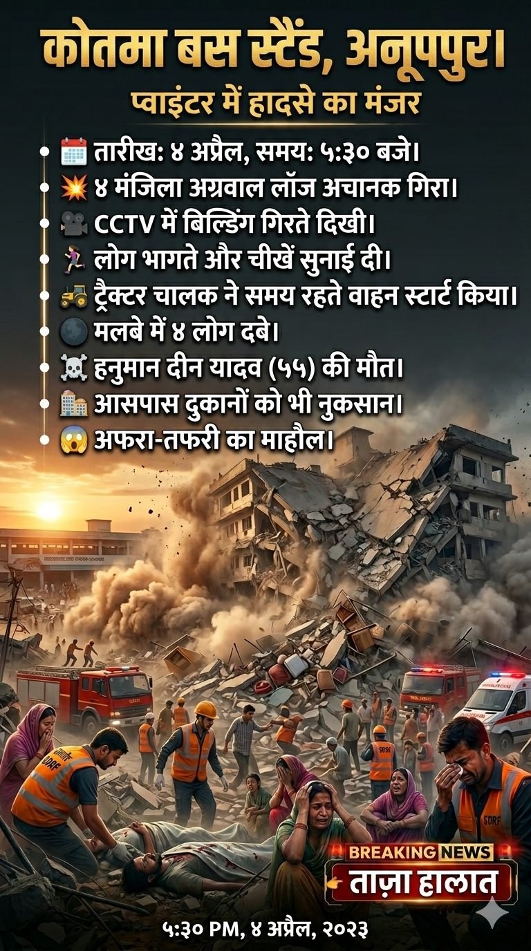 तारीख: 4 अप्रैल | जगह: कोतमा बस स्टैंड, अनूपपुर। शाम के करीब साढ़े पांच बजे थे। बाजार में रोज़ की तरह चहल-पहल थी। दुकानों के बाहर ग्राहक खड़े थे, कुछ लोग चाय पी रहे थे, तो कुछ अपने काम में व्यस्त थे। तभी अचानक एक जोरदार कंपन हुआ, फिर इमारत झुकने लगी और अगले ही पल चार मंजिला अग्रवाल लॉज मलबे में तब्दील हो गया।