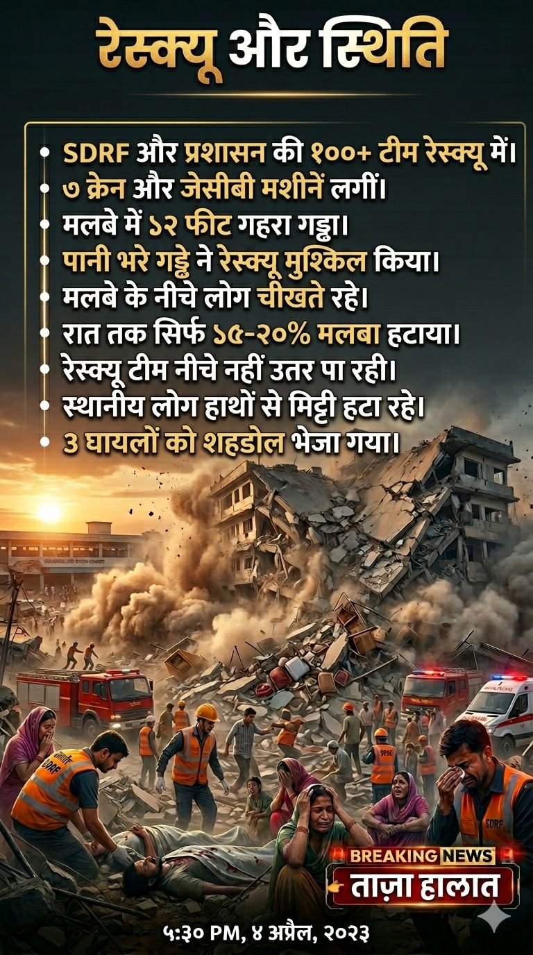 हालांकि मलबे में लोहे की रॉड और भारी कंक्रीट होने के कारण रेस्क्यू कार्य में काफी दिक्कतें आईं। रात 10:30 बजे तक केवल 15 से 20 प्रतिशत मलबा ही हटाया जा सका था।