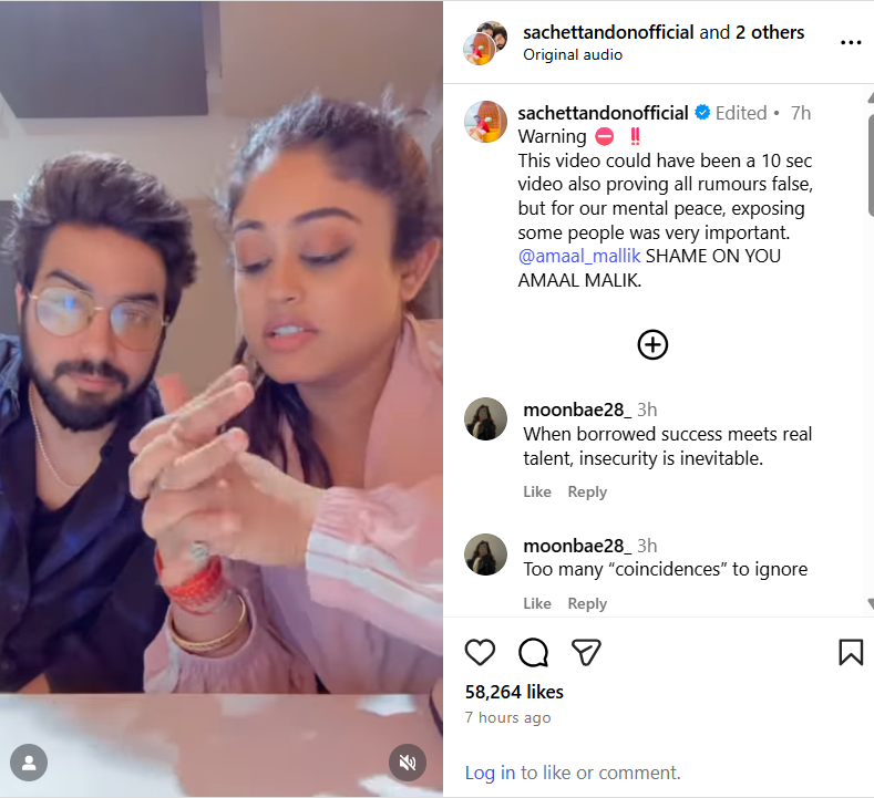 सचेत-परंपरा ने अपने सोशल मीडिया पर 7 मिनट 17 सेकंड का वीडियो पोस्ट किया। कैप्शन में लिखा “ये वीडियो 10 सेकंड में भी सच दिखा सकता था, लेकिन मेंटल पीस के लिए कुछ लोगों को बेनकाब करना जरूरी था… अमाल मलिक, तुम्हें शर्म आनी चाहिए।”