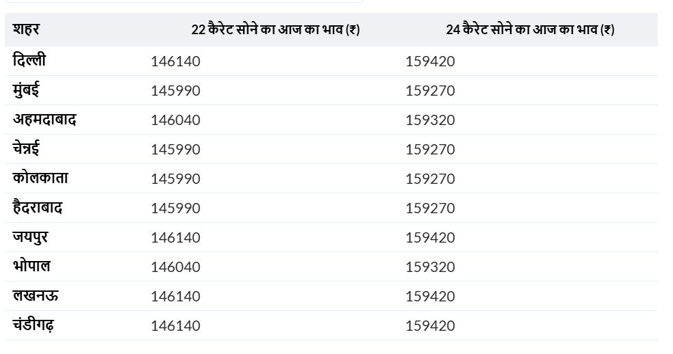 मुंबई, चेन्नई और कोलकाता: अभी मुंबई, चेन्नई और कोलकाता में 22 कैरेट सोने की कीमत 146,000 प्रति 10 ग्राम है, जबकि 24 कैरेट सोने की कीमत 159,280 प्रति 10 ग्राम है।