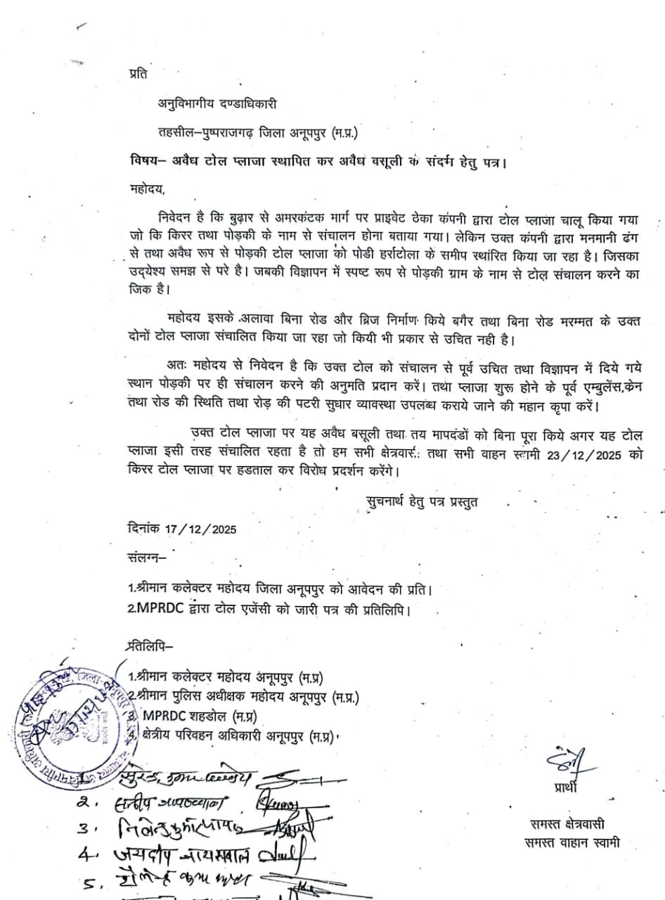 आवेदन में बताया गया है कि, अमरकंटक मार्ग पर एक निजी ठेका कंपनी की तरफ से टोल प्लाजा संचालित किया जा रहा है। जिसे किरर और पोड़की के नाम से चलाया जा रहा है। जबकि टोल प्लाजा की वास्तविक स्थिति पोड़की ग्राम के बजाय पोड़की-हर्राटोला के समीप स्थापित की जा रही है, जो विज्ञापन और अनुमति में दर्शाए गए स्थान से अलग है।