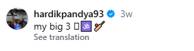 हार्दिक ने एक पोस्ट “माय बिग 3” के नाम से भी शेयर की थी। इसमें उन्होंने अपने तीन सबसे जरूरी रिश्तों का जिक्र किया क्रिकेट, अपने बेटे अगस्त्य और माहिका। पोस्ट में कई तस्वीरें और वीडियोज थे। एक तस्वीर में दोनों पूजा करते दिखे, दूसरी में हार्दिक उन्हें प्यार से गाल पर किस कर रहे थे, और एक फोटो में वह उन्हें गोद में उठाए मुस्कुरा रहे थे।