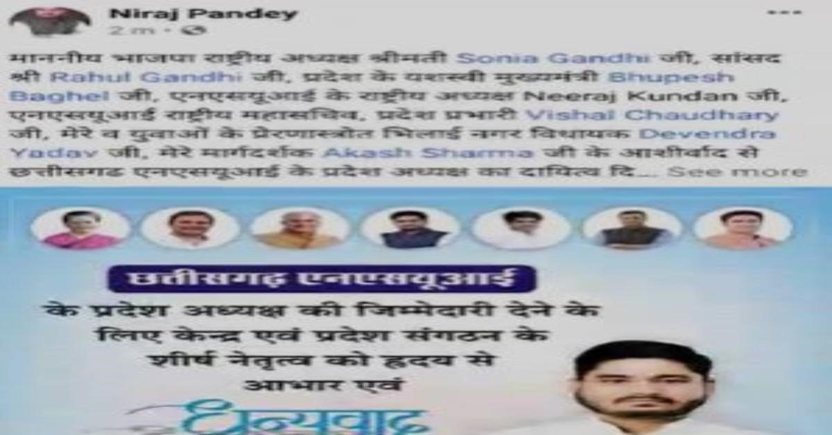 : पोस्ट से मचा बवाल: NSUI के नवनियुक्त प्रदेश अध्यक्ष नीरज पांडे ने सोनिया गांधी को बताया BJP की राष्ट्रीय अध्यक्ष, फिर सोशल मीडिया पर किरकिरी...