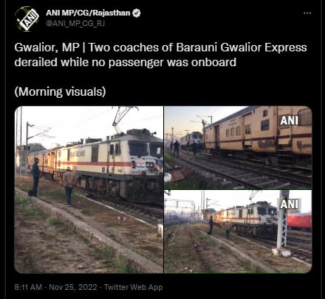 ग्वालियर स्टेशन पर बड़ा हादसा होने से टल गया। बरौनी एक्सप्रेस के दो कोच पटरी से उतर गए। गनीमत रही कि उस समय ट्रेन में कोई यात्री नहीं था